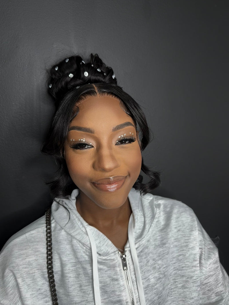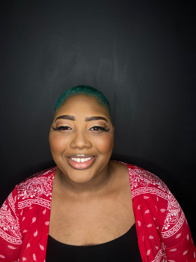 Woman client in a green dress standing in beat by bee's salon studio showcasing makeup on face